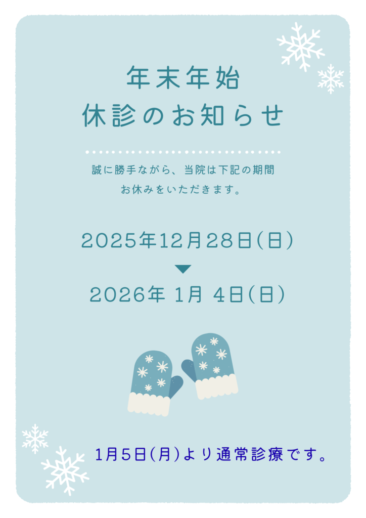 ■年末年始の休診日について 2025/12/05 お知らせ 上記の通り、2025年12月28日(日)〜2026年1月4日(日)の間は休診とさせていただきます。 また、休診日前後は混雑が予想されます。 診察の待ち時間が発生することをご了承いただけますと幸いです。 何卒よろしくお願いいたします。 WEB予約 TOPへ